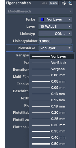 Unabhängig davon, wie die Linienstärken auf dem Bildschirm angezeigt werden, werden Objekte immer mit der von Ihnen angegebenen Linienstärke gedruckt.