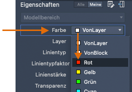 Die Palette Eigenschaftsprüfung enthält eine Liste aller wichtigen Eigenschafteneinstellungen. Sie können jedes der verfügbaren Felder klicken, um die aktuellen Einstellungen zu ändern. Wie in folgendem Beispiel dargestellt, wird die aktuelle Farbe von VonLayer zu Rot geändert, wenn keine Objekte ausgewählt sind. Allen nachfolgend erstellten Objekten wird die Farbeigenschaft Rot zugewiesen.