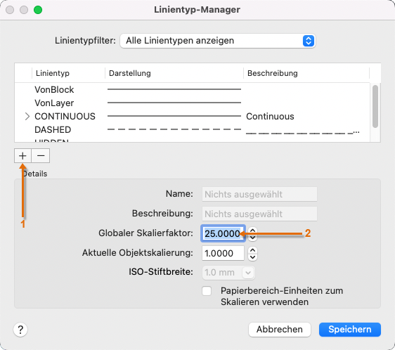 Klicken Sie im Menü Format auf Linientyp. Hierdurch wird das Dialogfeld Linientyp-Manager aufgerufen.