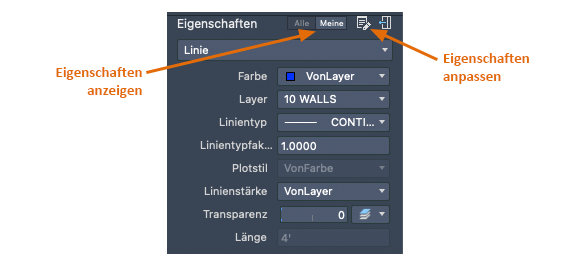 Sie können die Eigenschaftsprüfung so einstellen, dass alle Eigenschaften für die ausgewählten Objekte angezeigt werden oder eine personalisierte Liste der Eigenschaften angezeigt wird. Richten Sie Ihre personalisierte Eigenschaftenliste über die Schaltfläche Eigenschaften anpassen ein.