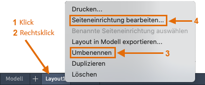 Als Erstes sollten Sie beim Zugriff auf die Registerkarte Layout (1) mit der rechten Maustaste auf die Registerkarte (2) klicken und ihr einen aussagekräftigeren Namen (3) als "Layout 1" geben. Namen, die eine bestimmte ANSI- oder ISO-Größe referenzieren, sind häufig eine gute Wahl.