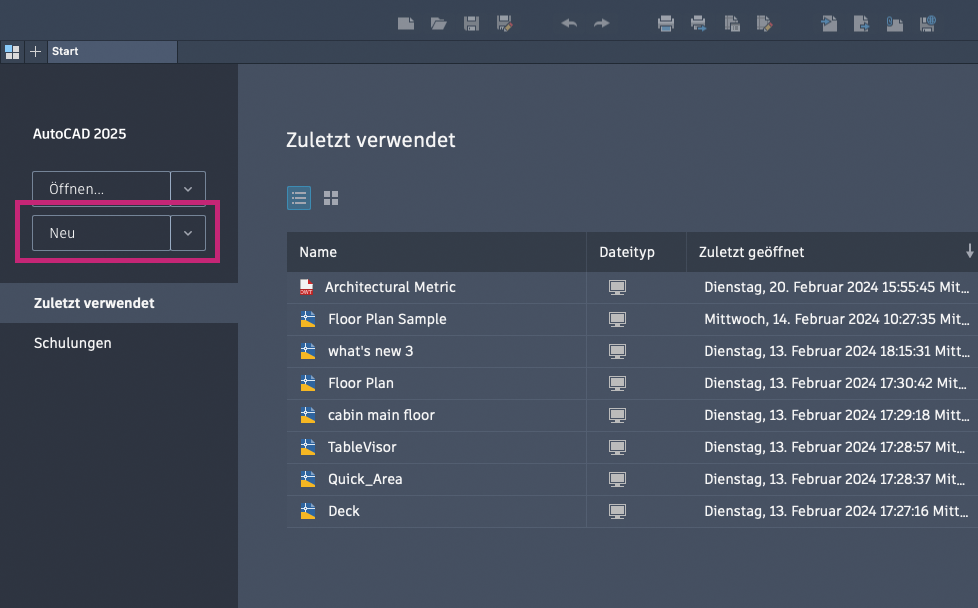 Klicken Sie nach dem Start von AutoCAD auf der Registerkarte Start auf Neu, oder klicken Sie auf die Dropdown-Liste Neu, um eine neue Zeichnung zu beginnen.