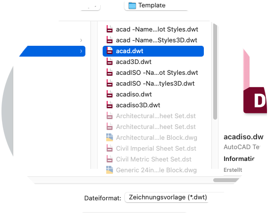 Sie können eine beliebige Zeichnungsdatei (.dwg) als Zeichnungsvorlagendatei (.dwt) speichern. Um eine Zeichnungsvorlagendatei auf Basis einer vorhandenen zu erstellen, öffnen Sie die vorhandene Zeichnungsvorlagendatei und ändern und speichern sie unter einem anderen Namen.