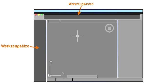 AutoCAD enthält einen Werkzeugsatz links neben dem Zeichenbereich. Fast alle Befehle aus diesem Handbuch können Sie über die Registerkarte Zeichnen aufrufen. Des Weiteren enthält der Werkzeugkasten oberhalb des Zeichenbereichs häufige Befehle wie Neu, Öffnen, Speichern, Drucken, Rückgängig usw.