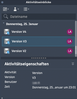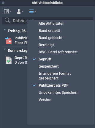 Anmerkung: Die Liste der Aktivitäten wird jedes Mal aktualisiert, wenn die Zeichnung gespeichert wird.