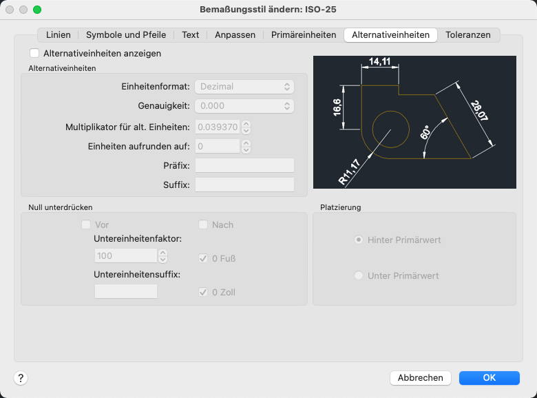 Steuert die Anzeige von Alternativeinheiten in Maßwerten und legt Format sowie Genauigkeit fest.