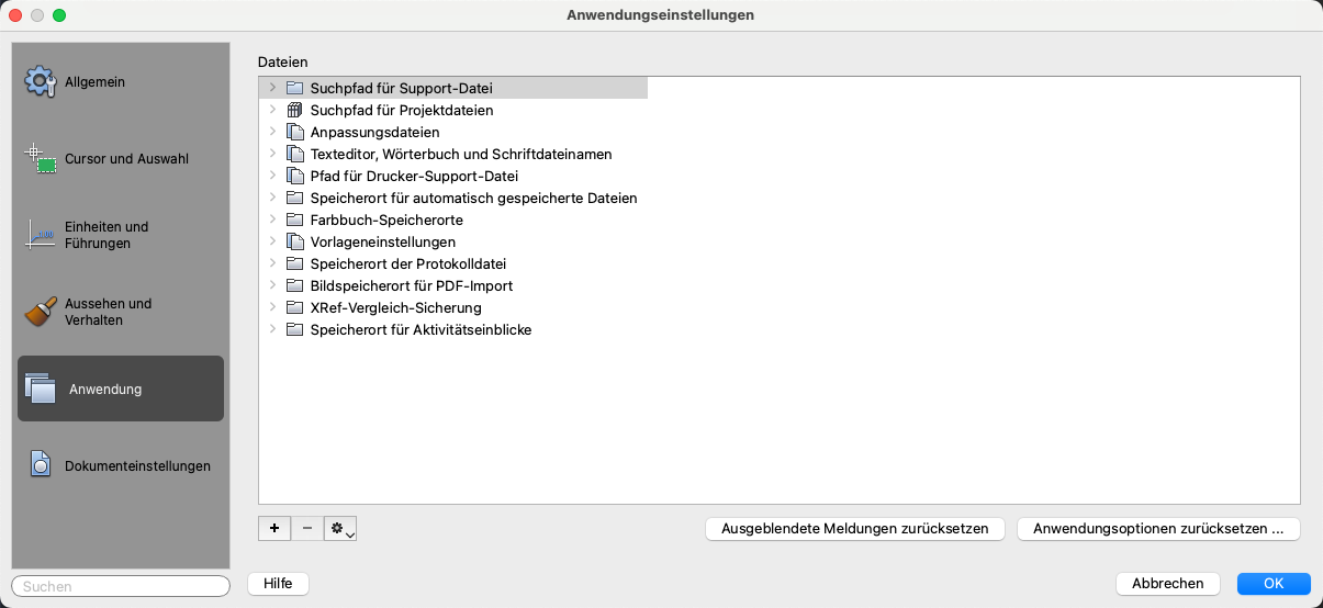 Führt die Ordner auf, in denen das Programm nach Support-, Treiber-, Menü- und anderen Dateien sucht. Darüber hinaus werden einige optionale, benutzerdefinierte Einstellungen aufgeführt, beispielsweise das Wörterbuch für die Rechtschreibprüfung.