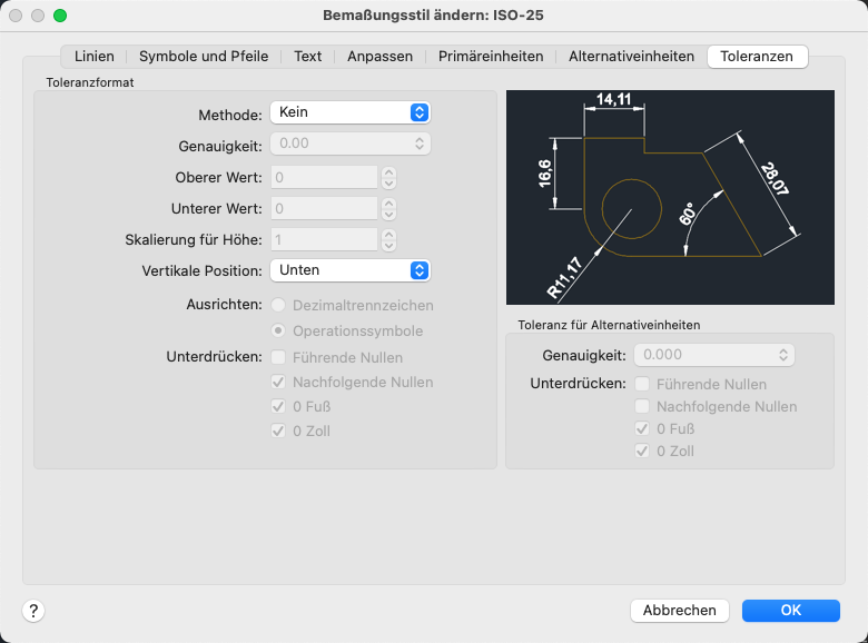 Bestimmt die Anzeige und das Format von Maßtexttoleranzen.