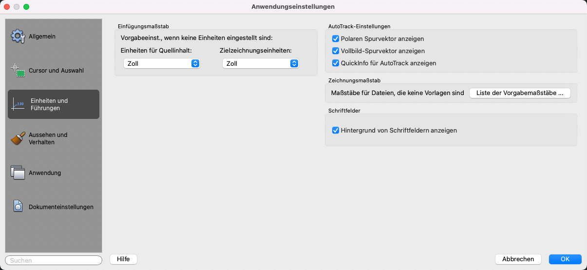 Legt die Einheiten fest, die beim Einfügen von Blöcken oder Referenzieren von Objekten verwendet, und welche Entwurfshilfslinien aktiviert werden.