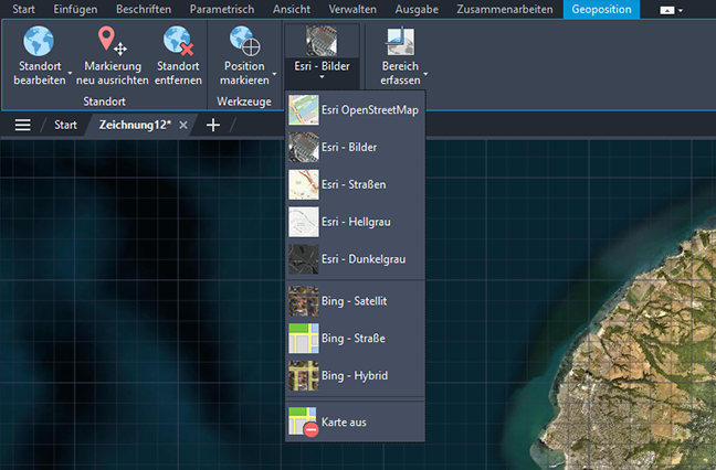 Es sind fünf neue Esri-Karten verfügbar, mit denen Sie Zeichnungen geografische Positionsdaten zuweisen können.