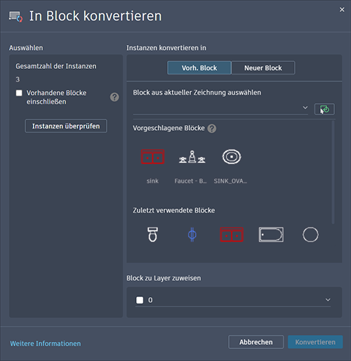 Bietet Optionen, mit denen Sie wählen können, ob ausgewählte Exemplare in einen vorhandenen Block konvertiert werden oder ein neuer Block erstellt werden soll.