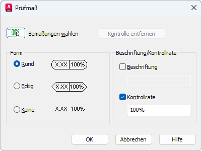 Verwenden Sie die Einstellungen für Form und Prüfbezeichnung/Kontrollrate, um die Darstellung des Rahmens für das Prüfmaß und den Wert für die Kontrollrate festzulegen.