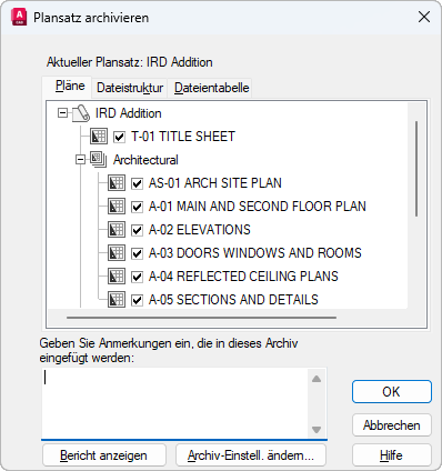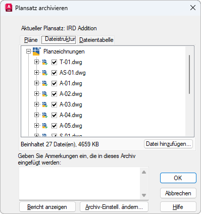 Enthält eine Liste der Pläne, die dem Archivpaket hinzugefügt werden. Die Reihenfolge entspricht der Reihenfolge der Pläne oder der Organisation des untergeordneten Satzes. Dazu muss ein Plansatz im Manager für Planungsunterlagen geöffnet sein. Sie können entweder die Archiv-Option aus dem Kontextmenü wählen, das Sie durch Rechtsklick auf den obersten Plansatzknoten öffnen, oder in der Befehlszeile ARCHIV eingeben.