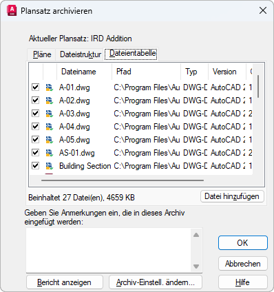 Listet die in das Archivpaket aufzunehmenden Dateien im Tabellenformat auf. Vorgabemäßig werden alle Dateien, die mit der aktuellen Zeichnung verknüpft sind (wie z. B. zugehörige XRefs, Plotstile und Schriften), aufgelistet. Sie können dem Archivpaket Dateien hinzufügen oder Dateien daraus entfernen. Zugehörige Dateien, auf die durch URLs verwiesen wird, werden nicht in das Archivpaket eingeschlossen.