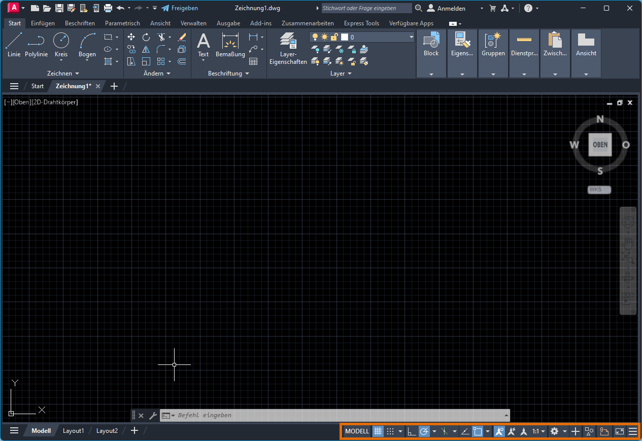 Über die Statusleiste können Sie schnell auf einige der am häufigsten verwendeten Zeichnungswerkzeuge zugreifen. Sie können zwischen Einstellungen wie Raster, Fang, Spurverfolgung und Objektfang umschalten. Außerdem können Sie zusätzliche Einstellungen für einige dieser Werkzeuge durch Klicken auf den Pfeil nach unten aufrufen.