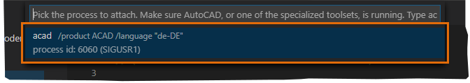 - If you choose AutoLISP Debug: Attach from the Configurations list, choose acad (or AutoCAD on Mac OS) from the list of running processes.