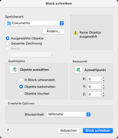 Im Dialogfeld Block schreiben werden unterschiedliche Vorgabeeinstellungen angezeigt, je nachdem, ob nichts, ein einzelner Block oder andere Objekte ausgewählt sind.