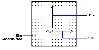 Die folgende Abbildung ist ein Beispiel für eine 16x16-Punktmatrix, die Sie zur Konstruktion eines erweiterten Big Fonts, wie zum Beispiel ein Kanji-Zeichen, verwenden können. In dem Beispiel beträgt der Abstand zwischen den einzelnen Punkten eine Einheit. Die Legende verweist auf eine Quadrateinheit.