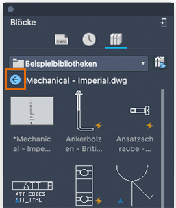 - Doppelklicken Sie auf eine Zeichnung in einem Ordner, um die Blöcke in dieser Zeichnung anzuzeigen. Verwenden Sie die Schaltfläche Zurück, um zum ausgewählten Ordner zurückzukehren.