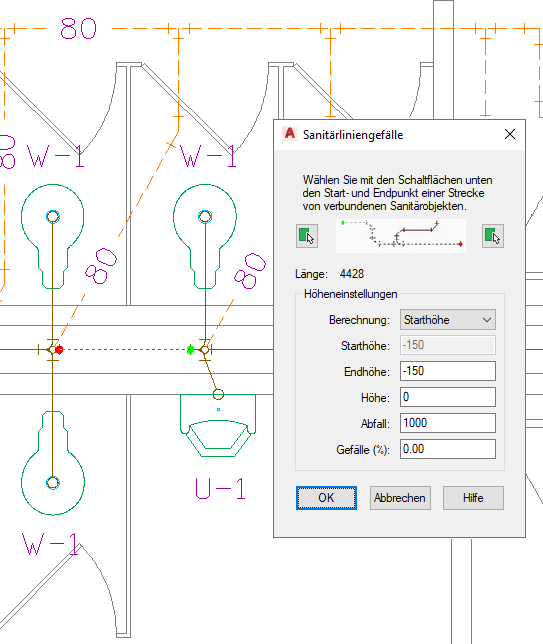 Mit dem Sanitärliniengefälle-Werkzeug können Sie die Starthöhe, Endhöhe oder das Gefälle einer Sanitärlinie basierend auf Start- oder Endpunkt der Strecke berechnen. Für die Software sind drei Angaben erforderlich: Startpunkt, Endpunkt oder Gefälle des Segments. Weitere Informationen finden Sie unter "Berechnen des Gefälles einer Sanitärlinie".