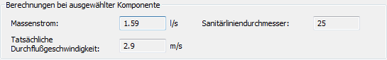 Der Bereich Berechnungen für längste Strecke im Dialogfeld Größe der Zuleitungssanitärlinie festlegen enthält die nicht bearbeitbaren berechneten Werte für die längste Strecke.