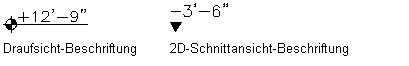 Sie können Ihren Zeichnungen Höhenkoten hinzufügen. Höhenkoten sind beim Erstellen von Werkplänen nützlich. Mit Höhenkoten in Zeichnungen helfen Sie dem Bauunternehmer zu überprüfen, dass die Höhe des Segments oder der Strecke dem erforderlichen Gefälle der Gebäudesysteme entspricht. Höhenkoten sind im DesignCenter verfügbar. Sie können das Symbol aus den DesignCenter in Ihre Zeichnung ziehen und das Segment auswählen, an dem Sie den Höhenkoten anbringen möchten. Die Höhe wird von den Segmenteigenschaften abgelesen. Wenn der Höhenkoten eine falsche Höhe anzeigt, sollten Sie überprüfen, ob das Objekt richtig positioniert ist.