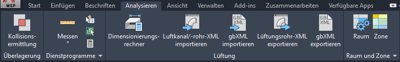 Die Registerkarte Analysieren enthält alle Befehle, die Sie für Konstruktionsberechnungen an den Objekten im aktuellen Arbeitsbereich benötigen. Diese Berechnungswerkzeuge sind in Lüftung, Elektro und anderen Arbeitsbereichen unterschiedlich.