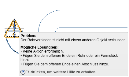 AutoCAD MEP 2025-Toolset zeigt optionale Lösungshinweise an, die die Stellen hervorheben, an denen ungültige Verbindungen zwischen Objekten im Layout vorhanden sind. In Lösungshinweisen wird das Problem beschrieben und mindestens eine mögliche Lösung aufgezeigt. Weitere Informationen finden Sie unter "Anzeigen von Lösungshinweisen".
