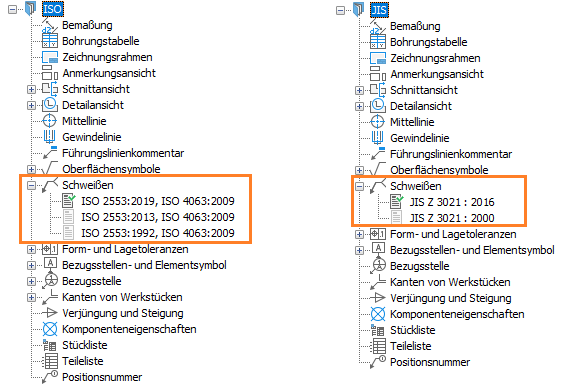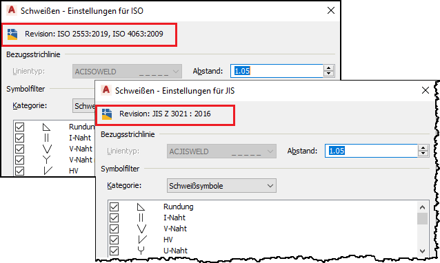 Im Dialogfeld Schweißen werden die neuesten ISO- und JIS-Revisionen angezeigt. Die entsprechenden Schweiß- und Nahtausführungssymbole werden auch im Symbolfilter aufgeführt.