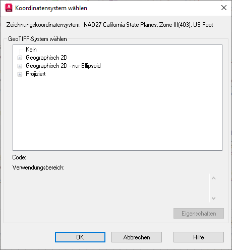 Gibt den GeoTIFF-Code für das ausgewählte Koordinatensystem an.