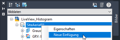 | 6 | Sie können weitere Kopien des Bilds einfügen, wenn Sie andere Histogramm-Steuerelemente zum Bearbeiten des Bilds ausprobieren möchten. Vergewissern Sie sich, dass der Bild-Manager geöffnet ist (klicken Sie dazu in der Multifunktionsleiste bei Bedarf auf die Registerkarte Rasterwerkzeuge Gruppe Verwalten und anzeigen Verwalten). Klicken Sie im Bild-Manager auf die Dropdown-Liste und wählen Sie Bilddaten. Erweitern Sie den Knoten LiveView_Histogram, klicken Sie mit der rechten Maustaste auf SiteAerial01 und wählen Sie Neue Einfügung.