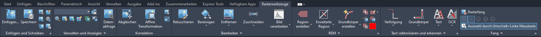 | REM | Bearbeitet bitonale, Farb- und Graustufen-Rasterdaten. Es stehen Optionen zur Verfügung, um Rasterobjekte auszuwählen und sie anschließend zu vektorisieren, bearbeiten oder entfernen. |