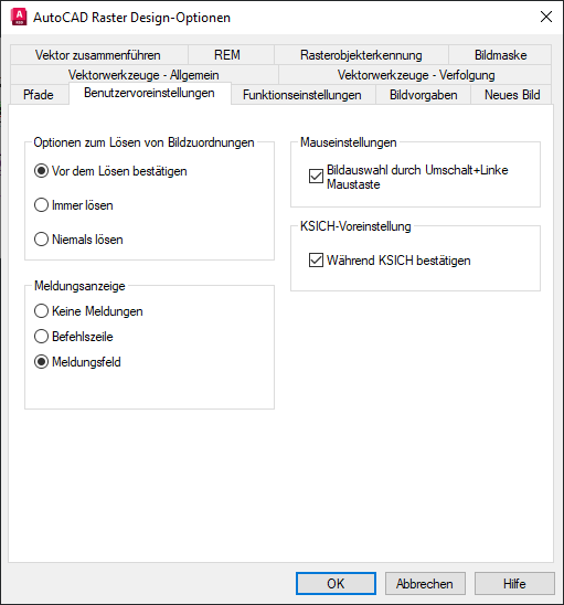 Benutzereinstellungen steuert das Lösen von Bildzuordnungen, Optionen für die Anzeige von Meldungen und die Einstellungen für die Maus. Mit Hilfe dieser Registerkarte können Sie auch die vorgabemäßigen Startoptionen festlegen.