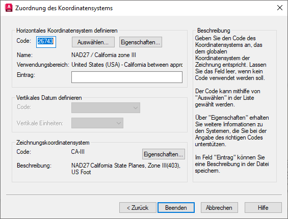 Wenn Sie ein Koordinatensystem festlegen möchten, lassen Sie das Feld Code leer.