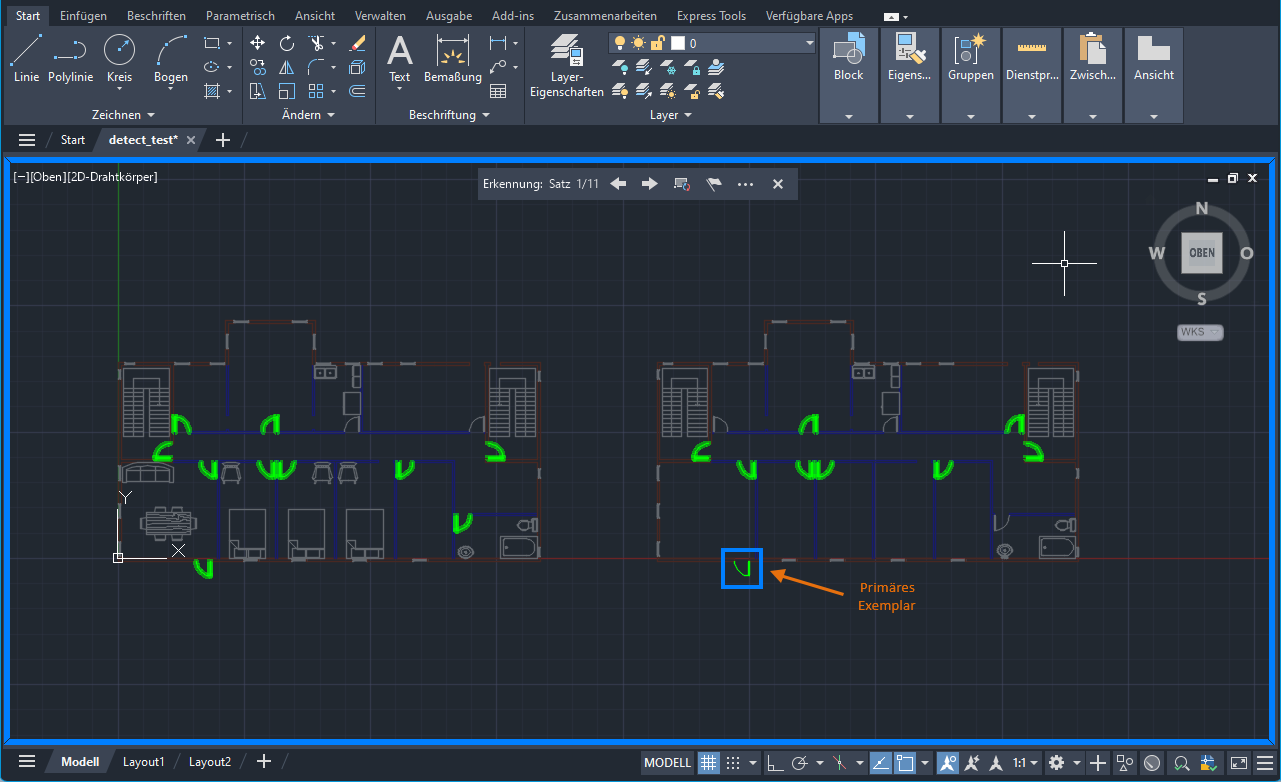 Im Überprüfungsmodus wird der Werkzeugkasten Erkennung oben im Zeichenfenster angezeigt. Dieser Werkzeugkasten enthält verschiedene Optionen zum Navigieren und Verwalten von Erkennungsergebnissen. Die Erkennungsergebnisse werden in Gruppen ähnlicher Objekte gruppiert. Ein Satz stellt eine Gruppe ähnlicher erkannter Objekte dar, die in Instanzen eines einzelnen Blocks konvertiert werden können.