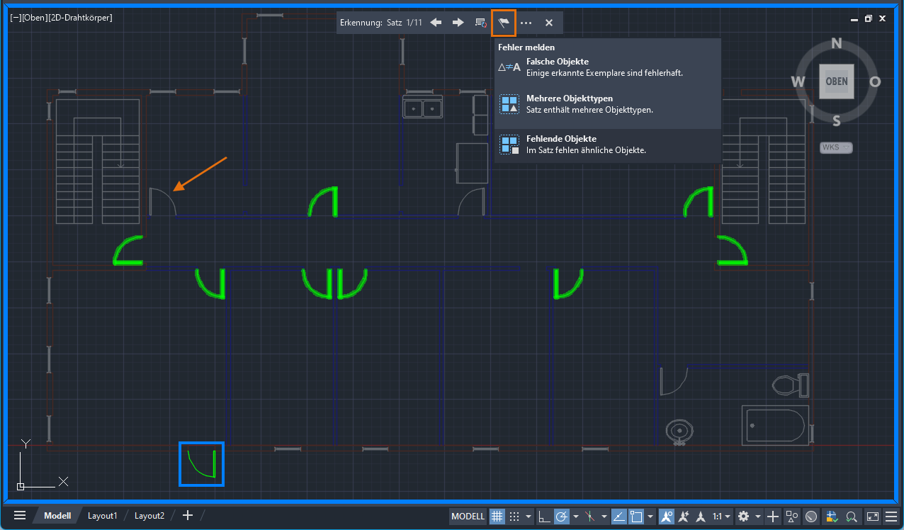 Beachten Sie, dass die Objekterkennung für Zeichnungen in der Draufsicht optimiert wurde. Die Objektarten, die AutoCAD erkennen kann, werden kontinuierlich erweitert. Die Objekterkennung funktioniert derzeit bei folgenden Objekten am besten: