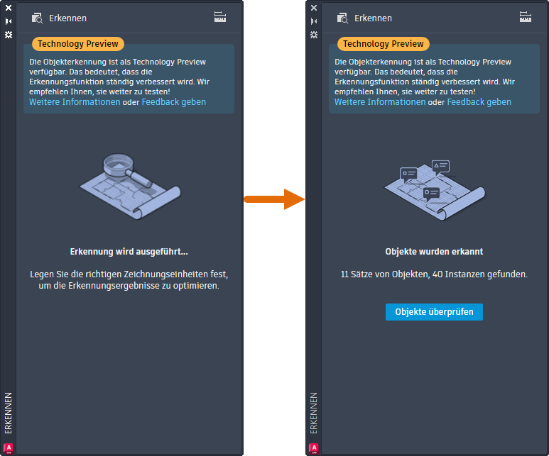 Um die Erkennungsgenauigkeit zu optimieren, während der Algorithmus für maschinelles Lernen weiter verbessert wird, wird empfohlen, die Zeichnung auf reale Einheiten einzustellen, bevor Sie die Erkennung starten.