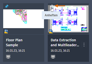 - Das Reißzweckensymbol wird jetzt in der oberen linken Ecke angezeigt, wenn Sie den Mauszeiger über die Miniaturansicht einer Zeichnung bewegen.