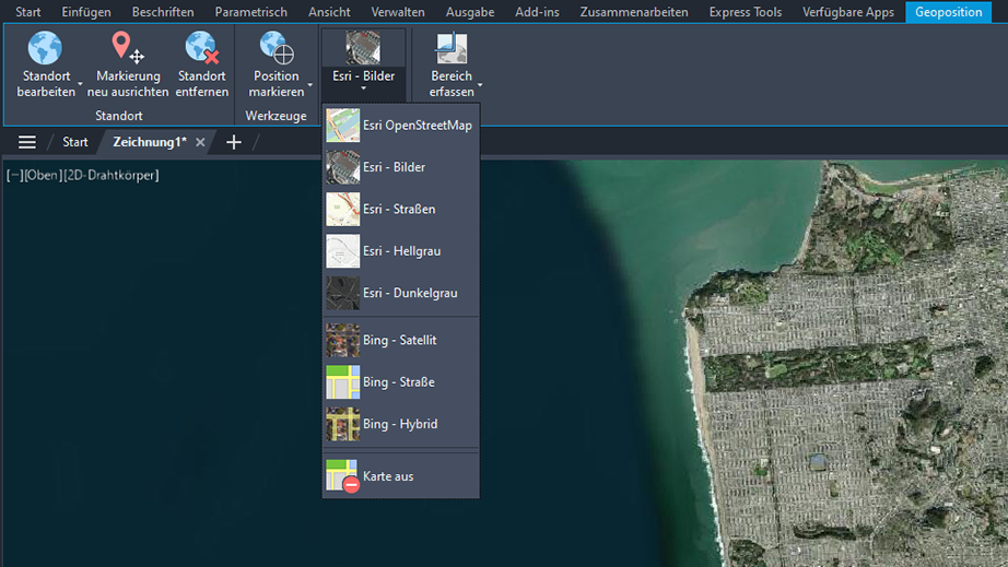 Es sind fünf neue Esri-Karten verfügbar, mit denen Sie Zeichnungen geografische Positionsdaten zuweisen können.