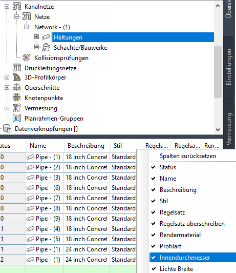 Sie können den Stil zahlreicher Haltungen oder Schächte/Bauwerke auf der Registerkarte Übersicht für dieses Kanalnetz schnell bearbeiten (siehe Abbildung 3).