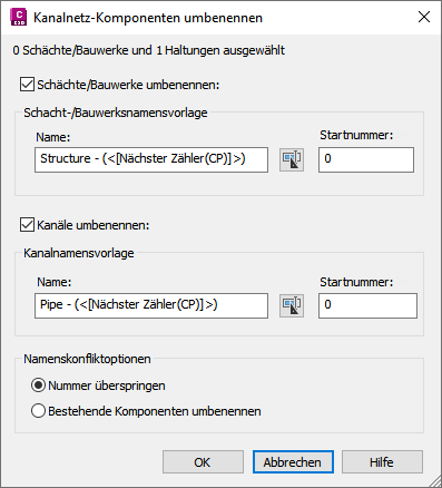 Komponenten umbenennen Sie können auswählen, ob nur Haltungen, nur Schächte/Bauwerke oder beides umbenannt werden soll.