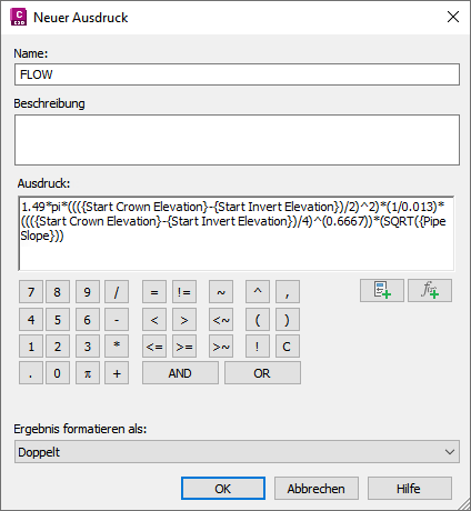 Der Haltungsradius (Pipe Radius) wurde durch den Ausdruck ((Start Crown Elevation – Start Invert Elevation)/2) ersetzt. Die Verwendung des Haltungsradius, einer benannten Komponente der Haltung, funktioniert in diesem Fall nicht fehlerfrei. Verwenden Sie auch nicht die Komponente {Inner Pipe Diameter}.