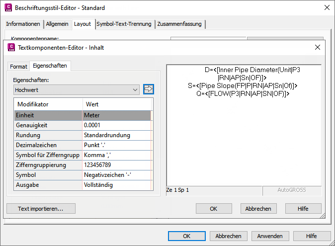 Im nächsten Schritt erstellen Sie einen Haltungsbeschriftungsstil für Lageplan und Längsschnitt, der diesen Flusswert anzeigt. In Abbildung 12 ist ein Beispiel dieses Beschriftungsstils mit allen zugehörigen Hydraulikeinstellungen zu sehen: