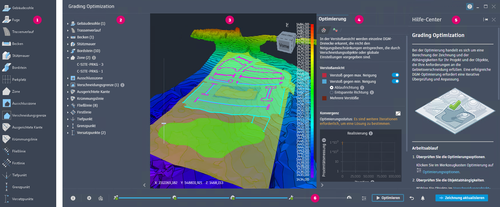 Hilfe-Center: Diese Gruppe bietet kontextbezogene Anleitungen beim Arbeiten in Grading Optimization. Arbeitsabläufe, Beispielzeichnungen und Links zu relevanten Lerninhalten sind ebenfalls verfügbar.