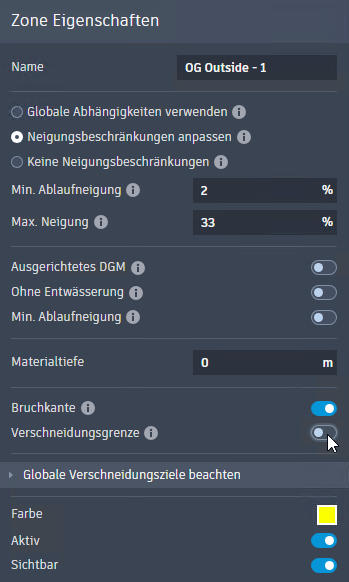 Im Werkzeugkasten Visualisierung können Sie unter den Visualisierungsthemen wählen, einschließlich Verletzungen, Abtrag/Auftrag und Höhe.