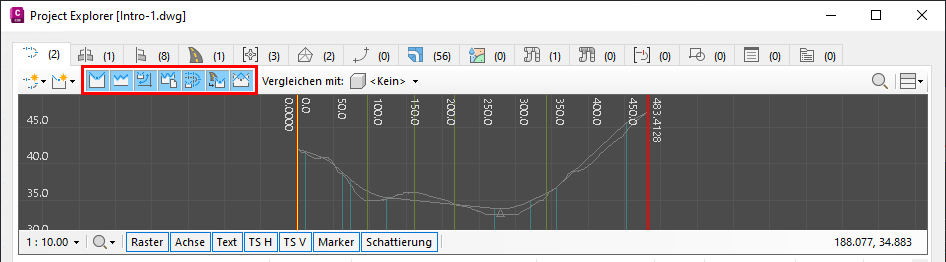 Der vertikale Überhöhungswert sowie die Einstellungen zum Ein-/Ausblenden für die einzelnen visuellen Komponenten eines bestimmten Höhen- oder Querprofilplans können auch über die zugehörigen Ansichtssteuerelemente im Project Explorer-Hauptfenster gesteuert werden, wie unten angegeben.