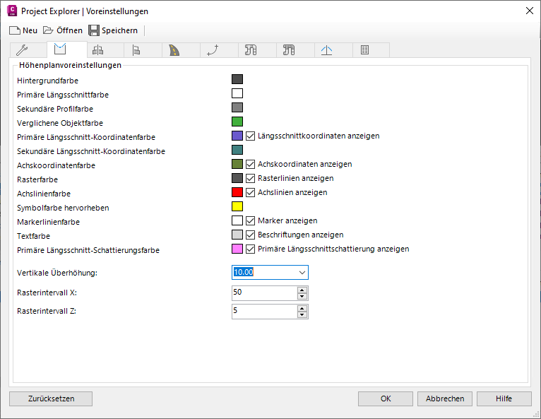 Über die übrigen fünf Registerkarten im Fenster Voreinstellungen in Project Explorer steuern Sie die Farb-, Stil-, Raster- und Skalierungseinstellungen der verschiedenen Höhen- und Querprofilpläne im Project Explorer-Hauptfenster.