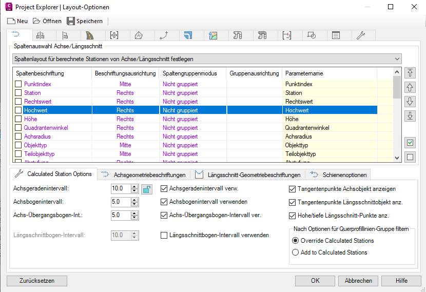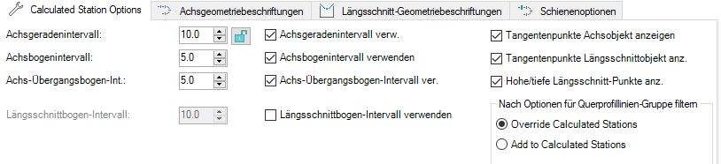 Diese Einstellungen steuern den Inhalt der Unterobjektliste Berechnete Stationen für Achsen und Längsschnitte.