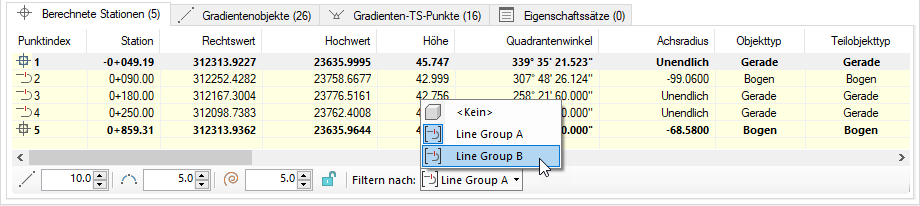 Diese Einstellungen beziehen sich auf den Querprofillinien-Gruppenfilter auf der Registerkarte Achse.
