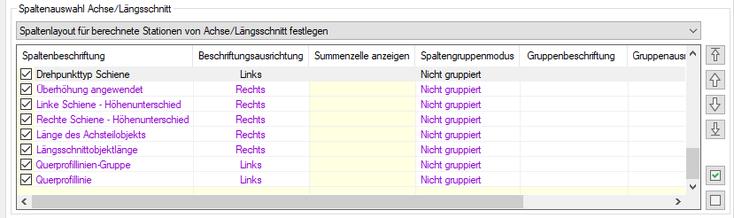 Zusätzlich zu den standardmäßigen Spaltenlayout- und -beschriftungsoptionen bietet die Registerkarte Achsen im Fenster Layout-Optionen eine Reihe von speziellen Optionen zum Steuern der Anzeige und Formatieren von Achs- und Längsschnitt-bezogenen Stations- und Objektdaten.